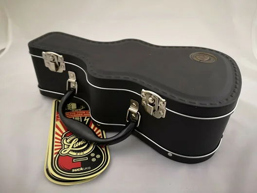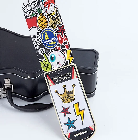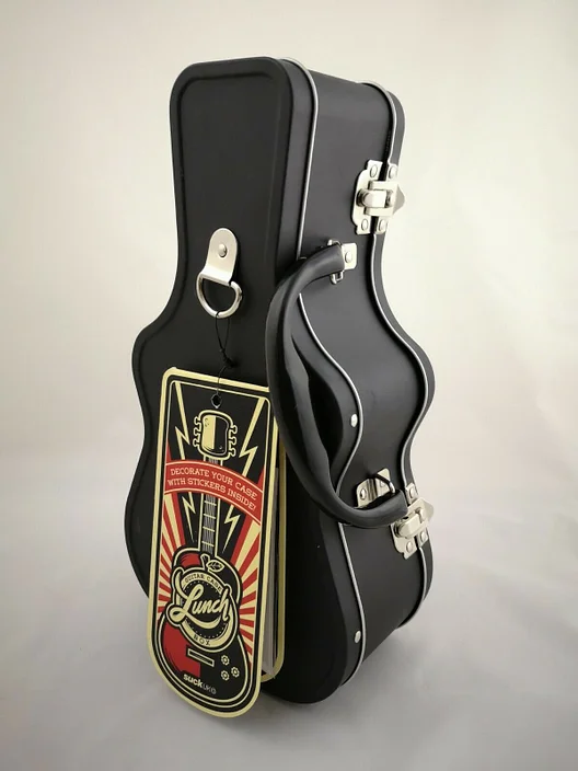 The guitar case lunch box is made from tin with a plastic handle, uses clasps to securely close the lunch box that are similar to clasps you'll find on an actual guitar case, and the lunch box comes with a set of 10 stickers that allows you to pick and choose the stickers that you'd like to decorate your mini guitar case with.