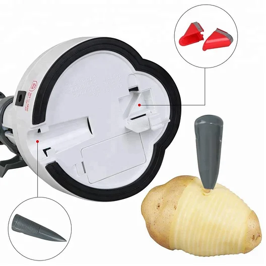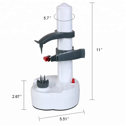 Humanized button design, just gently press, start peeling automatically. Movable fixed needle can adapt to different vegetable & fruit height. The Robotized arm can adjust thickness and automatic balance in peeling process, keeps thickness uniformly. The bottom holder can fix vegetable & fruit in its rotation process. No need to hold the vegetable during peeling, safe to hands!